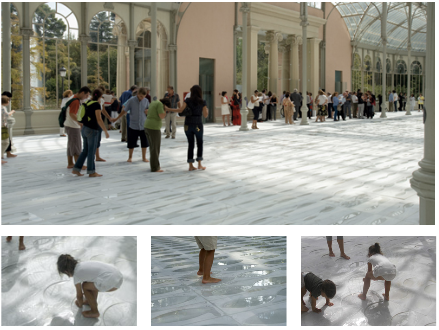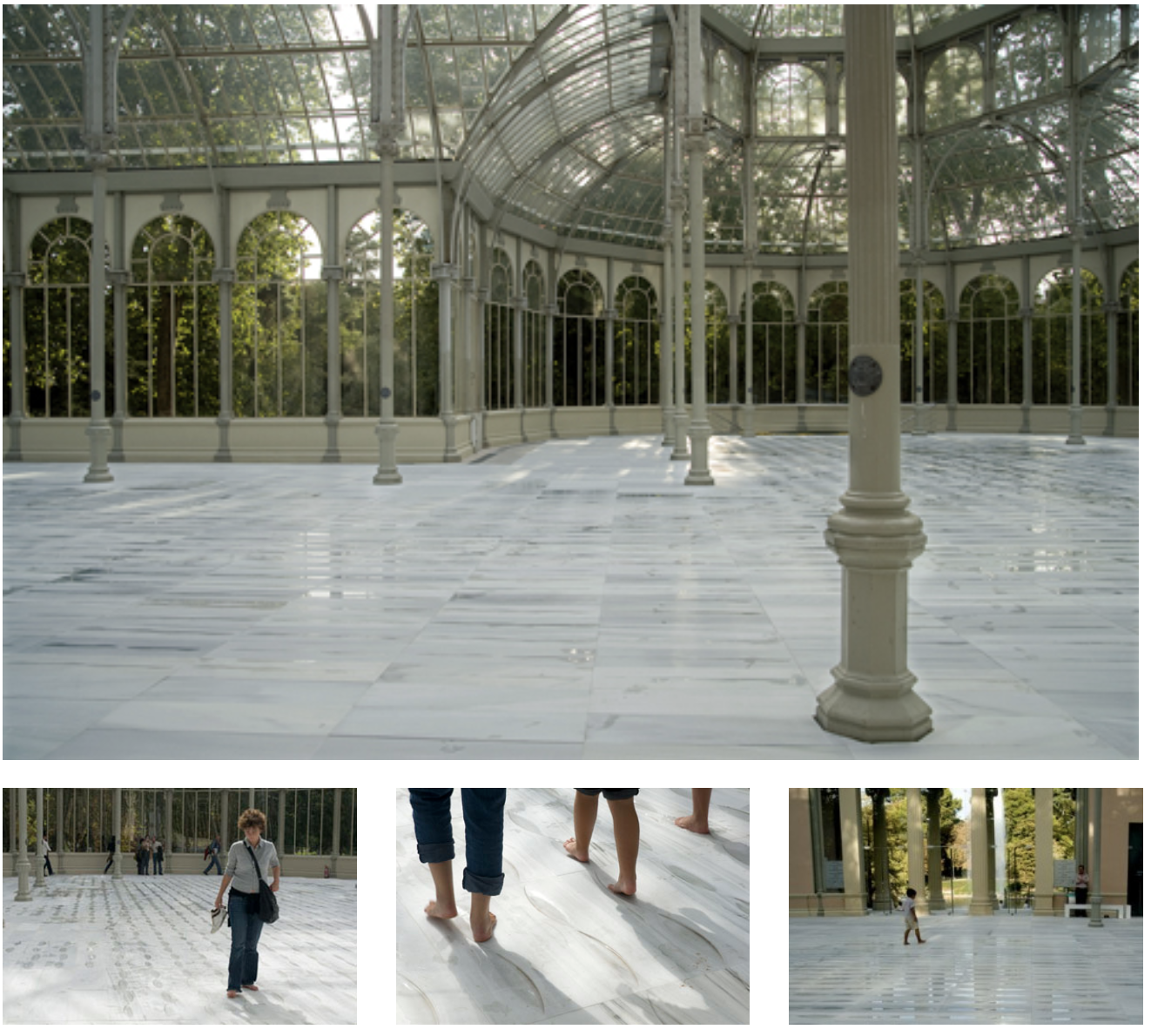 «escultura» está constituida por una trama regular de losas de mármol blanco, una sucesión de incisiones curvas en forma de S, y unas depresiones generadas a partir de las curvas en las que se forman los charcos de agua. La reflexión de la luz sobre el agua y la propia evaporación convierten a esta escultura en una obra sujeta a los cambios de la luz y de la temperatura ambiente. La obra es transitable con los pies desnudos. La posibilidad de pisar los charcos de agua y sentir las depresiones labradas en el mármol convierten al espectador en paseante y al volumen de la escultura en un paisaje.