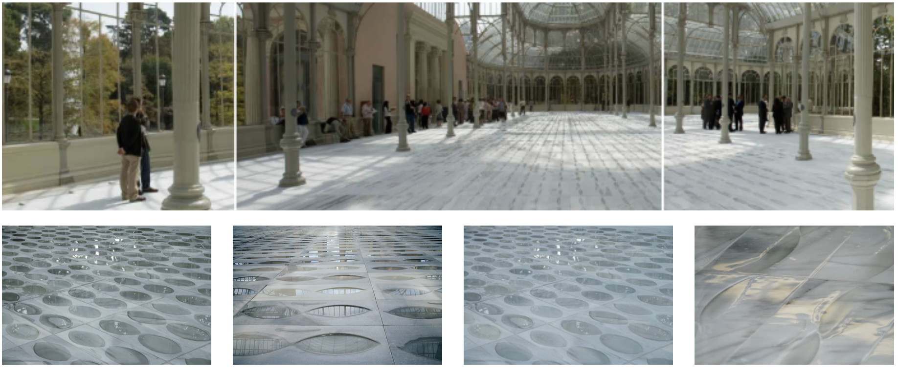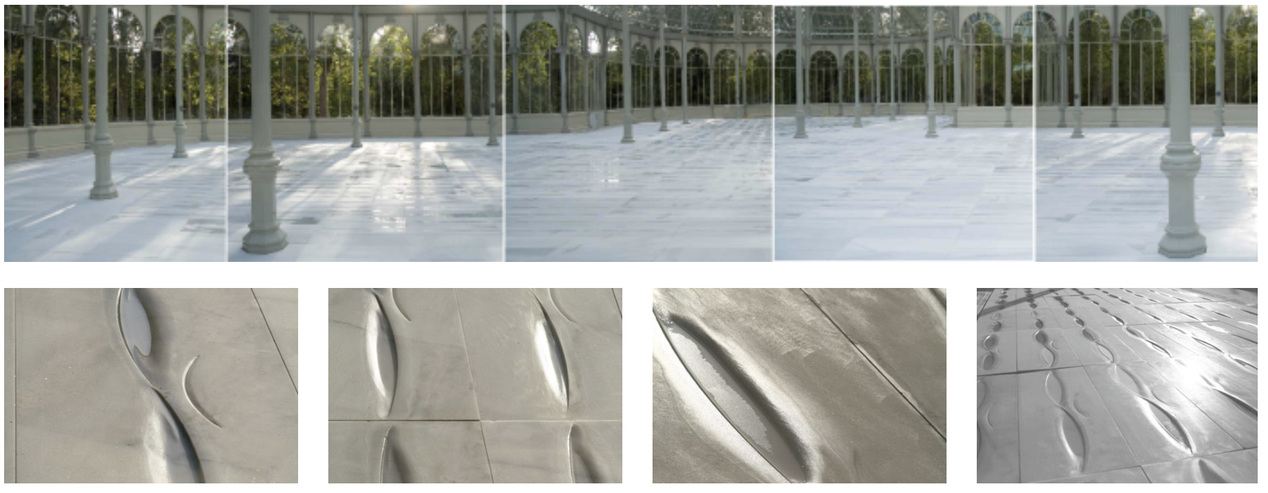 «escultura» es una superficie de 1.000 m2 de mármol blanco de Macael y agua formada por 3.204 piezas de 3x100x33 cm., que cubren la totalidad de la planta del Palacio de Cristal.